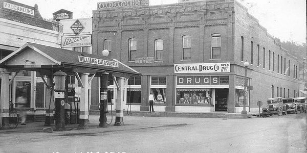 This photo from the 1920s showcases a bustling corner of Williams, Arizona, where the Grand Canyon Hotel stands prominently. By this era, drivers were increasingly visiting the Grand Canyon, marking a shift from earlier horse and buggy travel. The presence of automobiles and the Williams Auto Supply signifies the growing accessibility and modernization of travel, as more visitors began exploring the iconic landscape via car. This scene captures a dynamic period of transition, reflecting both the technological advancements and the enduring charm of historic landmarks like the Grand Canyon Hotel.